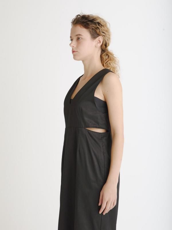 サイドのスリットが特徴的なノースリーブワンピース。深いVネックと高めの