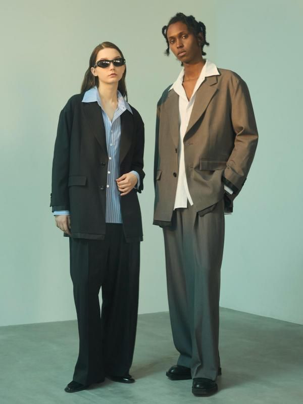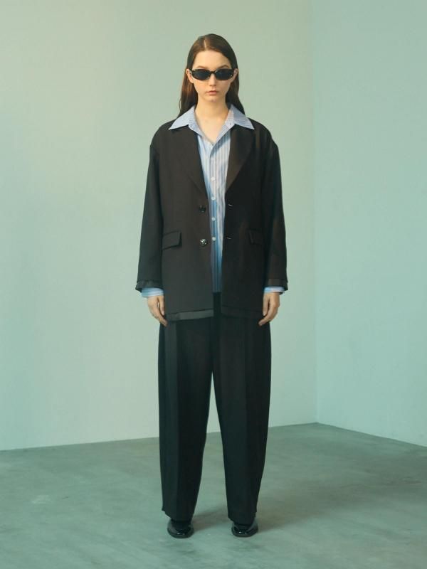 落ち感と軽い着心地を重視した素材。オーバーな身幅で艶感のある着こなしに。